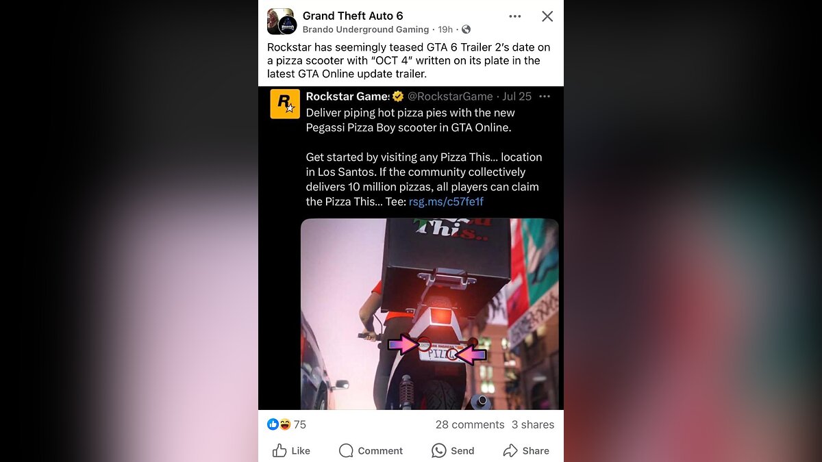 Трейлер GTA 6 вышел много месяцев назад, поэтому фанаты снова начали искать намеки на хоть какой-то анонс. Недавно Rockstar выпустила ролик, посвященный внутриигровому событию Pizza Delivery, и геймеры считают, что он хранит важный секрет.