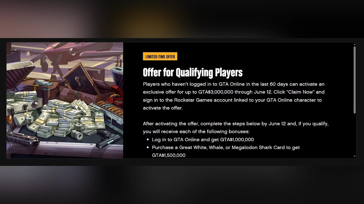 Забрать подарок можно до 12 июня. Выплачиваемая сумма делится на три части. 1 млн GTA$ дают за вход в игру. Еще 1,5 млн GTA$ можно получить при покупке карты «Большая белая акула», «Акула-кит» или «Мегалодон». Оставшиеся 500 тыс GTA$ дают за подписку GTA+.