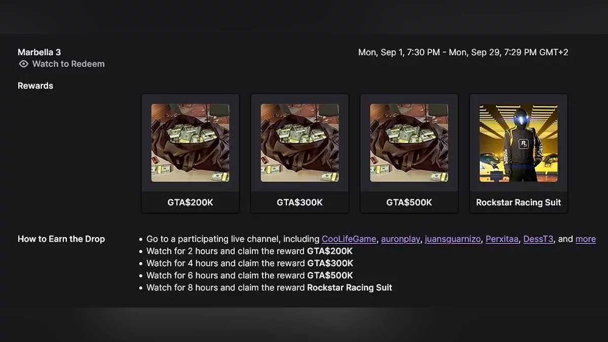 Rockstar Games запустила новую акцию для игроков GTA Online. Все, кто связал свои учетные записи Rockstar Games и Twitch, смогут получить внутриигровые бонусы, просто наблюдая за трансляциями испаноязычных авторов контента GTA RP в рамках события Marbella 3, которое проходит с 1 по 29 сентября.
