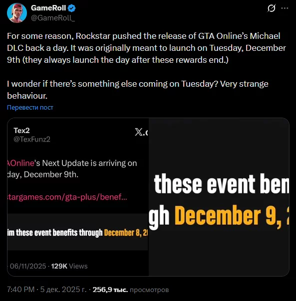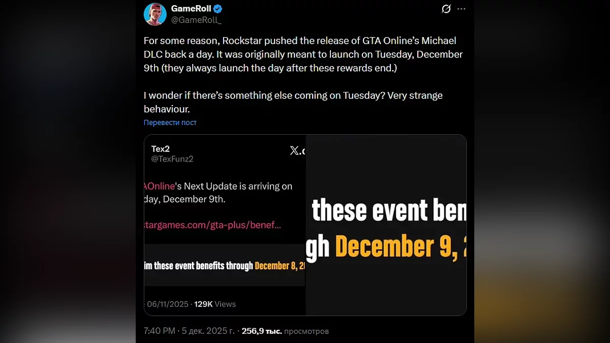 Rockstar Games довольно неожиданно сместила дату выхода DLC о Майкле для GTA Online. Изначально обновление должно было появиться во вторник, 9 декабря, что соответствовало привычному графику — студия обычно выпускает контент сразу после окончания еженедельных наград и бонусов.