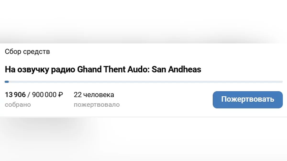 В марте мы сообщали о том, что GamesVoice собрала запрашиваемую сумму на русскую озвучку GTA: San Andreas. Теперь студия начала сбор средств (900 тыс руб) на локализованное радио. Кампания проходит на сайте VK.