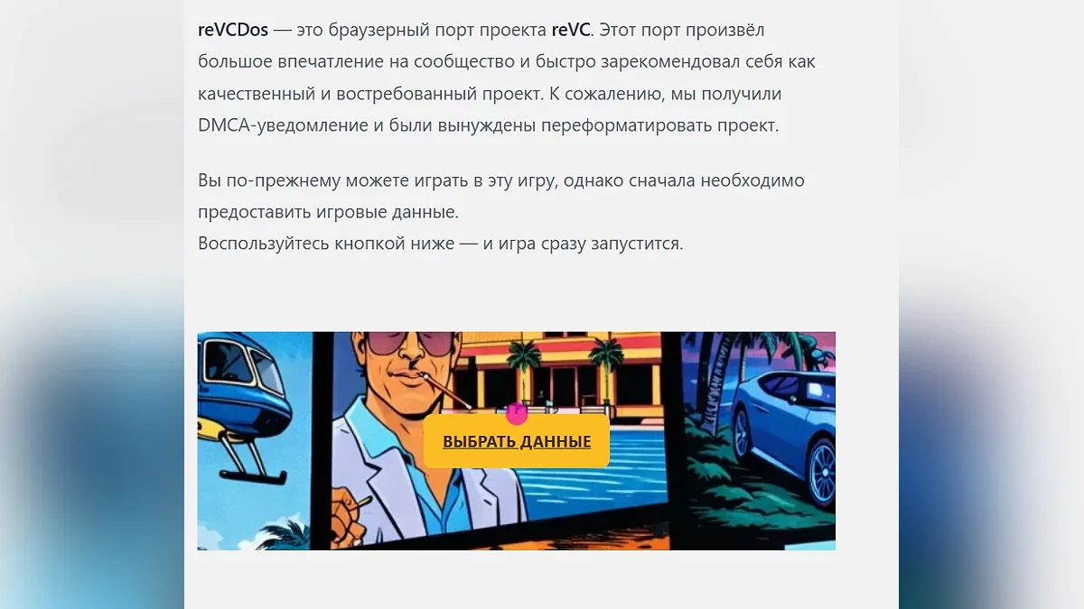 Обновлённый reVCDos больше не распространяет игровые данные напрямую. Теперь для запуска пользователю необходимо самостоятельно предоставить файлы оригинальной Vice City, используя специальную кнопку.