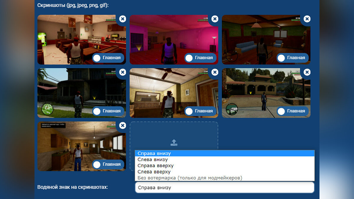 Теперь скриншоты к файлу удобно редактировать. Меняйте порядок скриншотов, перетаскивая их мышкой; меняйте положение водяного знака (который, к слову, тоже обновился). А модмейкерам добавлен приятный бонус — водяной знак можно вообще отключить.