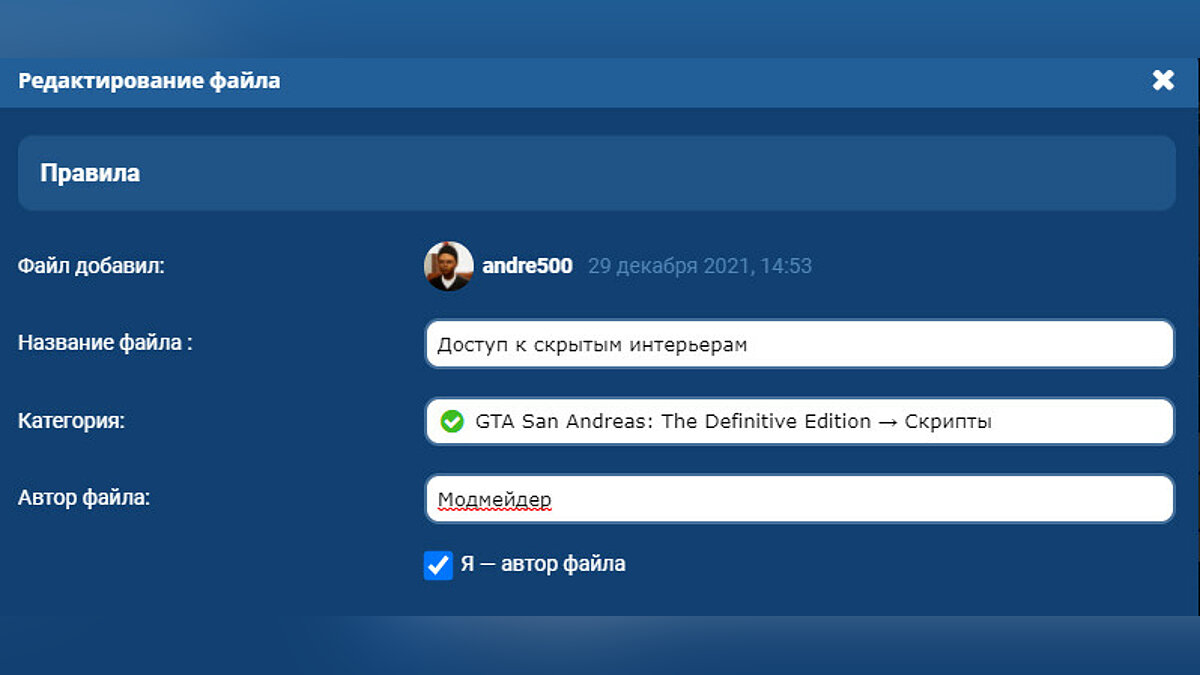 Теперь вы можете установить галочку, подтверждающую ваши авторские права на модификацию. С галочкой вы можете вписать любой свой никнейм в поле «Автор файла».