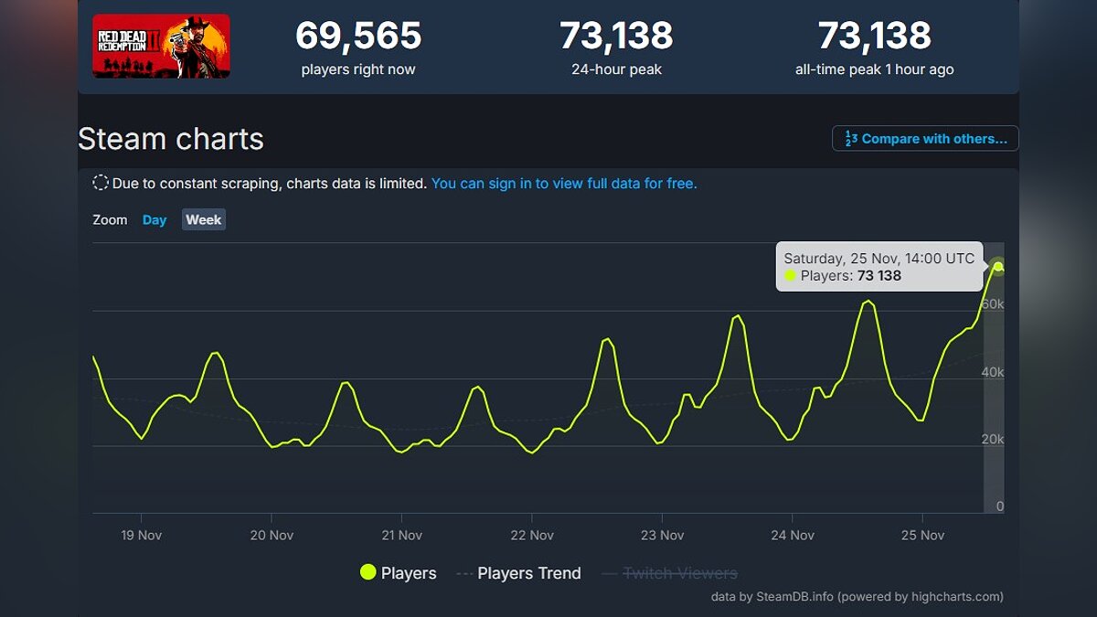 Ковбойский экшен Red Dead Redemption 2 побил свой рекорд по количеству игроков в Steam — произошло это благодаря большой осенней распродаже, где проект получил скидку 67% (до 28 ноября игра стоит 19,79 долларов в США и 19,79 евро в Европе). 25 ноября пик онлайна составил 73138 человек — это лучший показатель проекта с момента релиза в сервисе Valve, который состоялся четыре года назад.