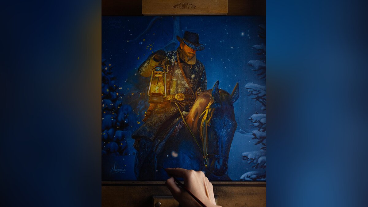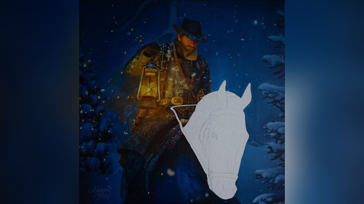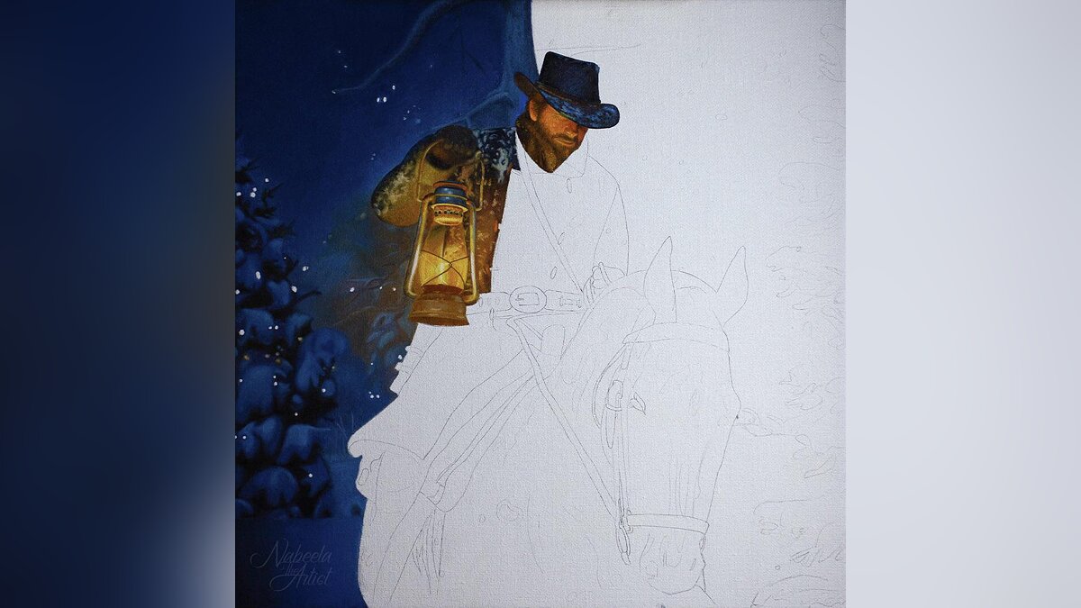 Художница NabeelaTheArtist опубликовала на Reddit потрясающую картину по мотивам Red Dead Redemption 2. На ней изображена одна из первых сцен, где главный герой игры Артур Морган пробирается через сугробы.