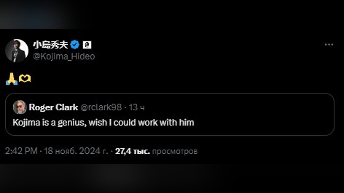 «Кодзима — гений, хотел бы я с ним поработать», — написал он в соцсетях, выразив свое уважение автору Metal Gear и Death Stranding. Ответ Хидео Кодзимы не заставил долго себя ждать: