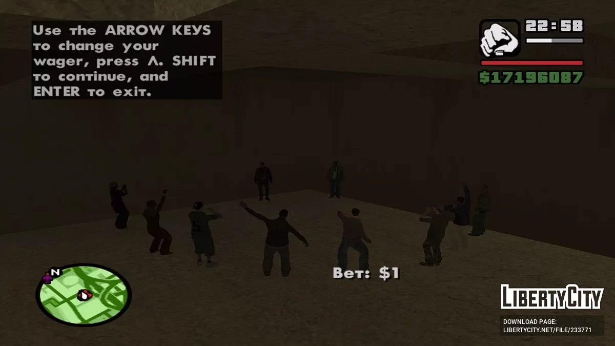 Этот CLEO-мод добавляет в GTA San Andreas новую активность — подпольные уличные бои, которые проходят в подземной парковке одного из зданий Лос-Сантоса. Вы можете приезжать туда, чтобы делать ставки на бойцов и смотреть поединки. Местоположение и до...