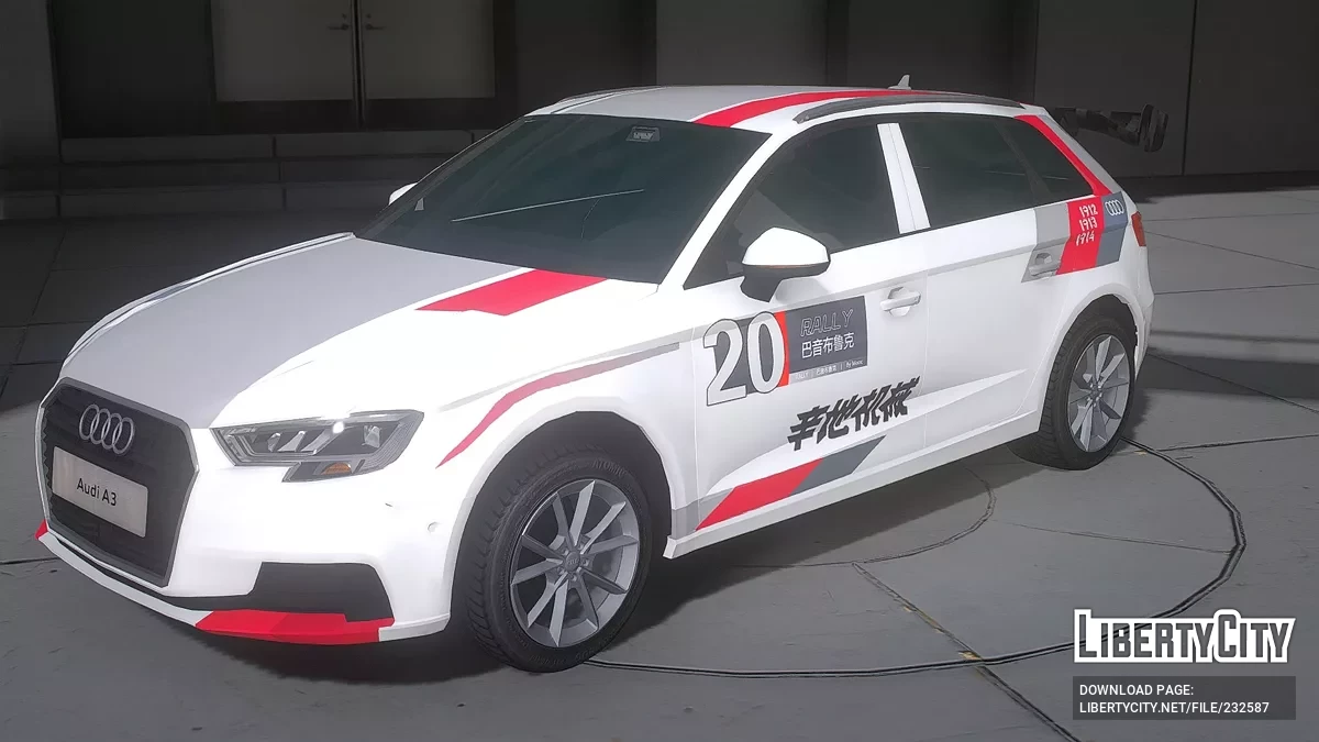 Audi A3 Rally для GTA 5. Передняя часть: Фронтальная часть выполнена в стиле серийной Audi A3, но усилена: бампер с выраженными угловыми секциями и чёрной нижней вставкой подчёркивает спортивный характер раллийной версии. Шестиугольная решётка S...